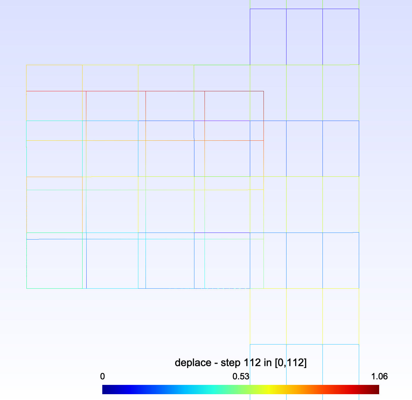 - avec un accroissement de la charge très petit cela conduit à des accroissement des ddl très très petit. Dans l'exemple fournit on observe des accroissement des ddl de l'ordre de 1.e-5 à 1.e-6 voir moins !