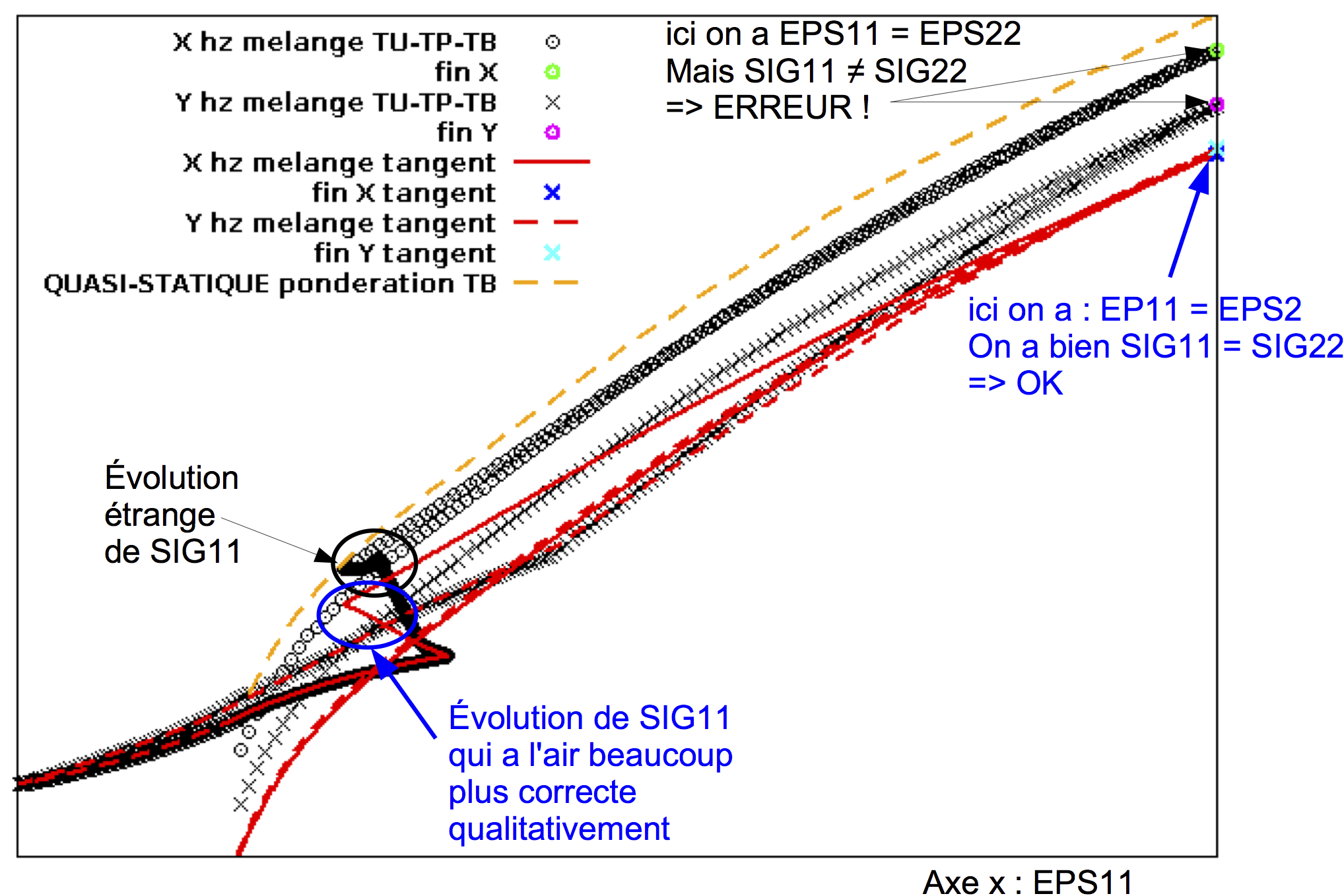 la courbe orange représente le comportement théorique de ce modèle si on avait un chargement purement monotone de traction équibiaxiale. ça permet de mettre en évidence la forte dépendance au trajet des lois HYPOELAS. Tout à droite du graphique, l'état de déformation est équibiaxial. La loi rouge "tangent" est qualitativement correcte : SIG11=SIG22. Mais quantitativement, ce n'est pas bon. La contrainte obtenue après de sévères changements de trajet est bien inférieure au cas orange purement monotone.