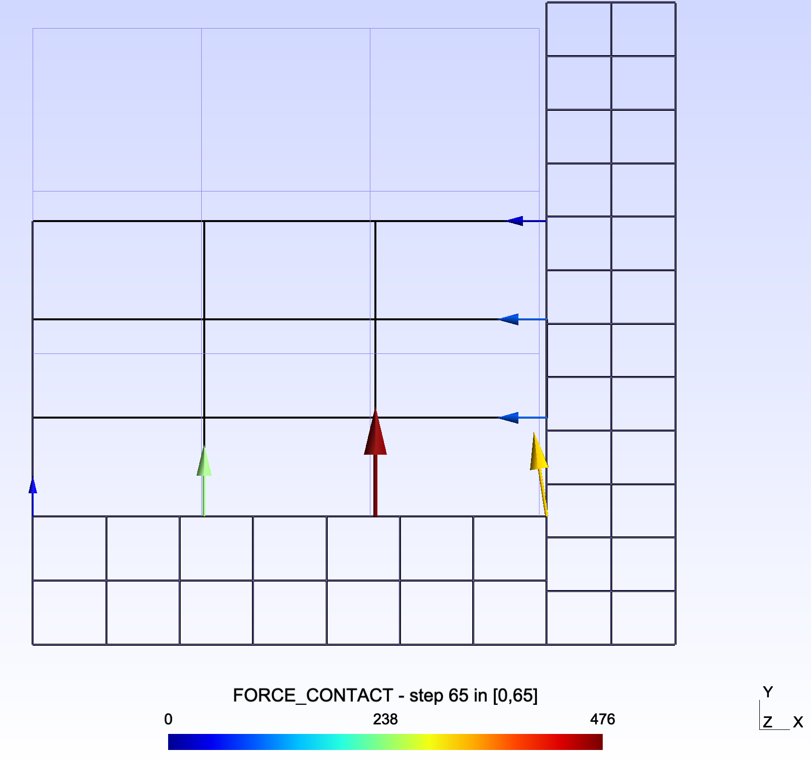 2) L'écrasement a lieu entre t=1 et t=2 par déplacement imposé selon Y sur le bord du haut du plot => le contact vertical doit être détecté dès le premier pas de temps, puis interviendra le contact horizontal