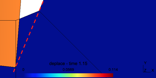 Si je le passe à 1e-3 (ou même 1e-2), la normale est correcte avec une composante horizontale+verticale, même en fin de calcul. Donc la bonne situation recherchée pour ce contact. Mais néanmoins toujours ce segmentation fault (le calcul n'atteint pas la fin).