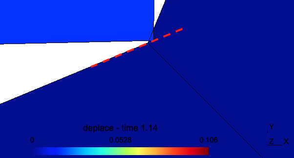 2) le noeud du coin trouve une situation d'équilibre un peu pénétrée dans la matière de l'élément de congé n°2. Mais on devine qu'il s'agit d'une prolongation du contact avec l' élément 1 (avec le pointillé rouge, on voit qu'il est aligné avec l'arête 1).